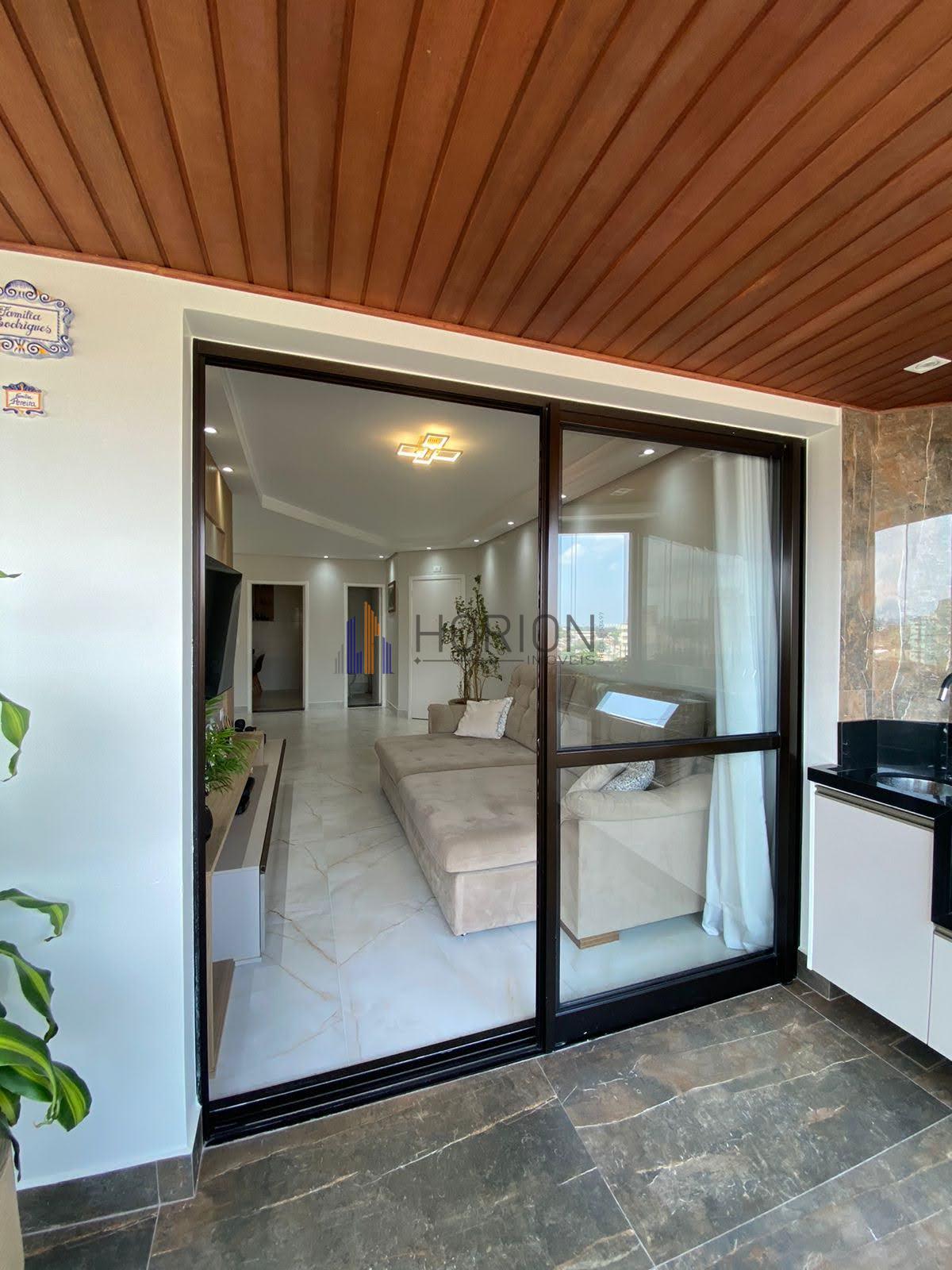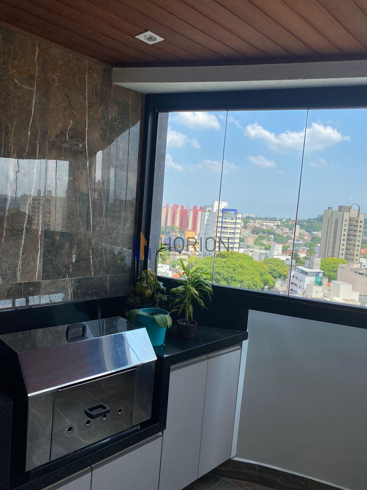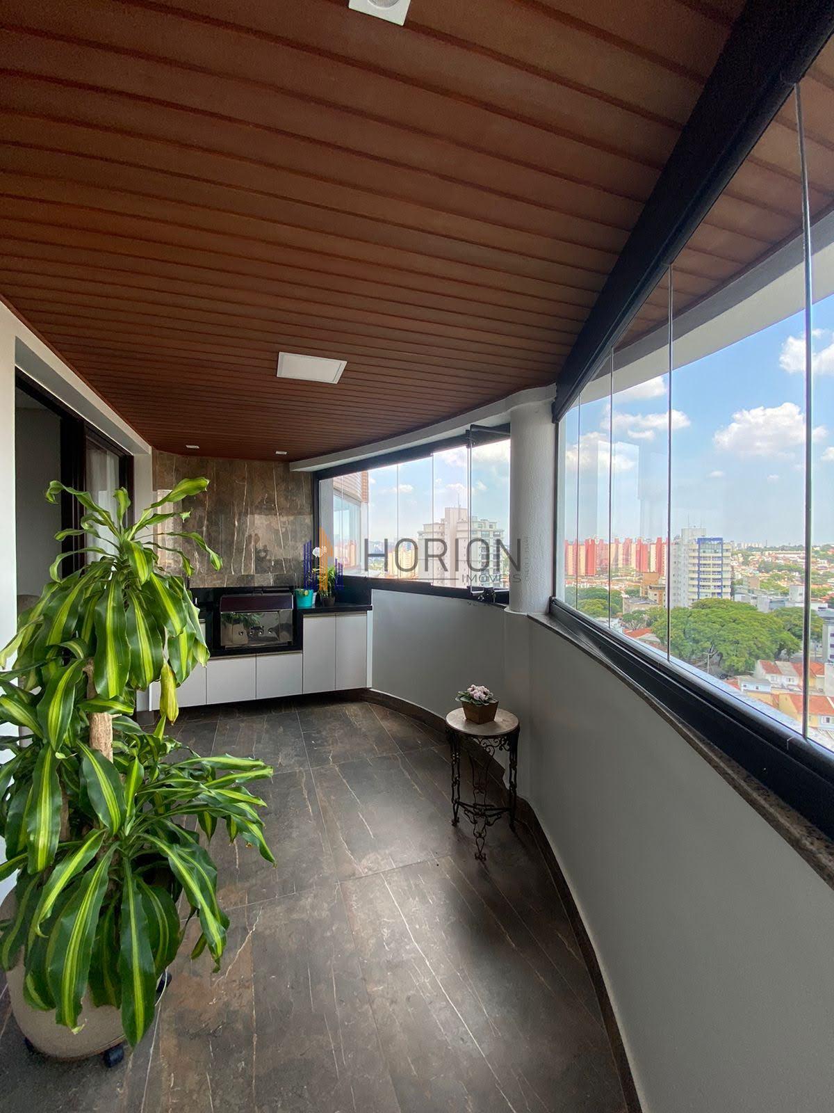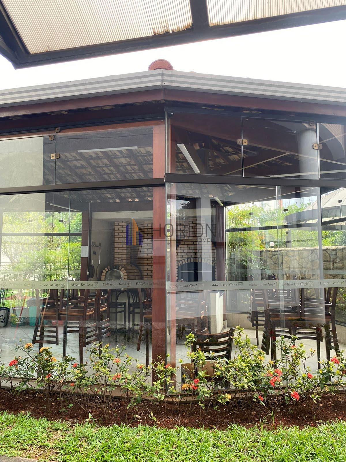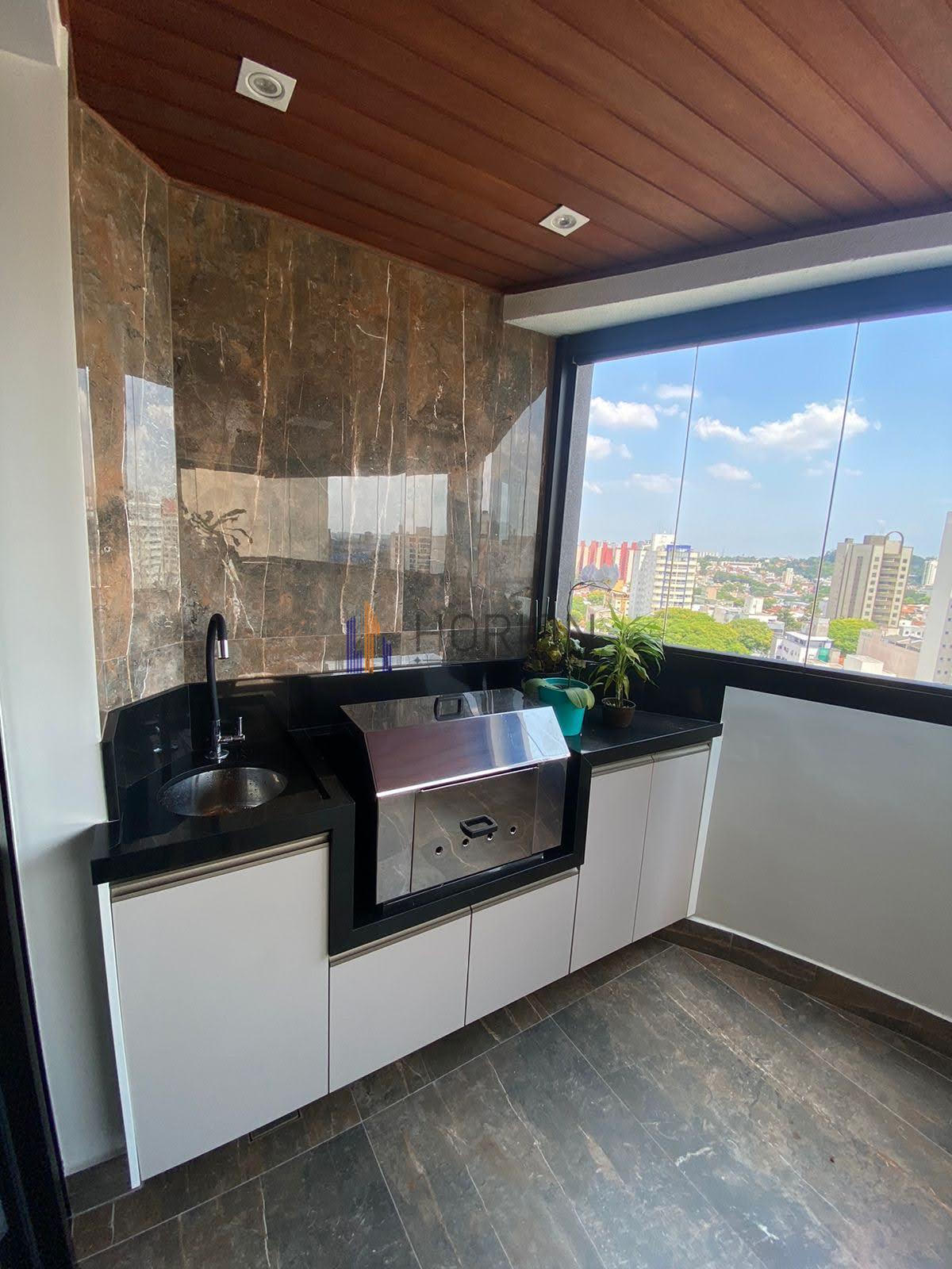 varanda envidraçada, com pequeno armário planejado e pia e churrasqueira