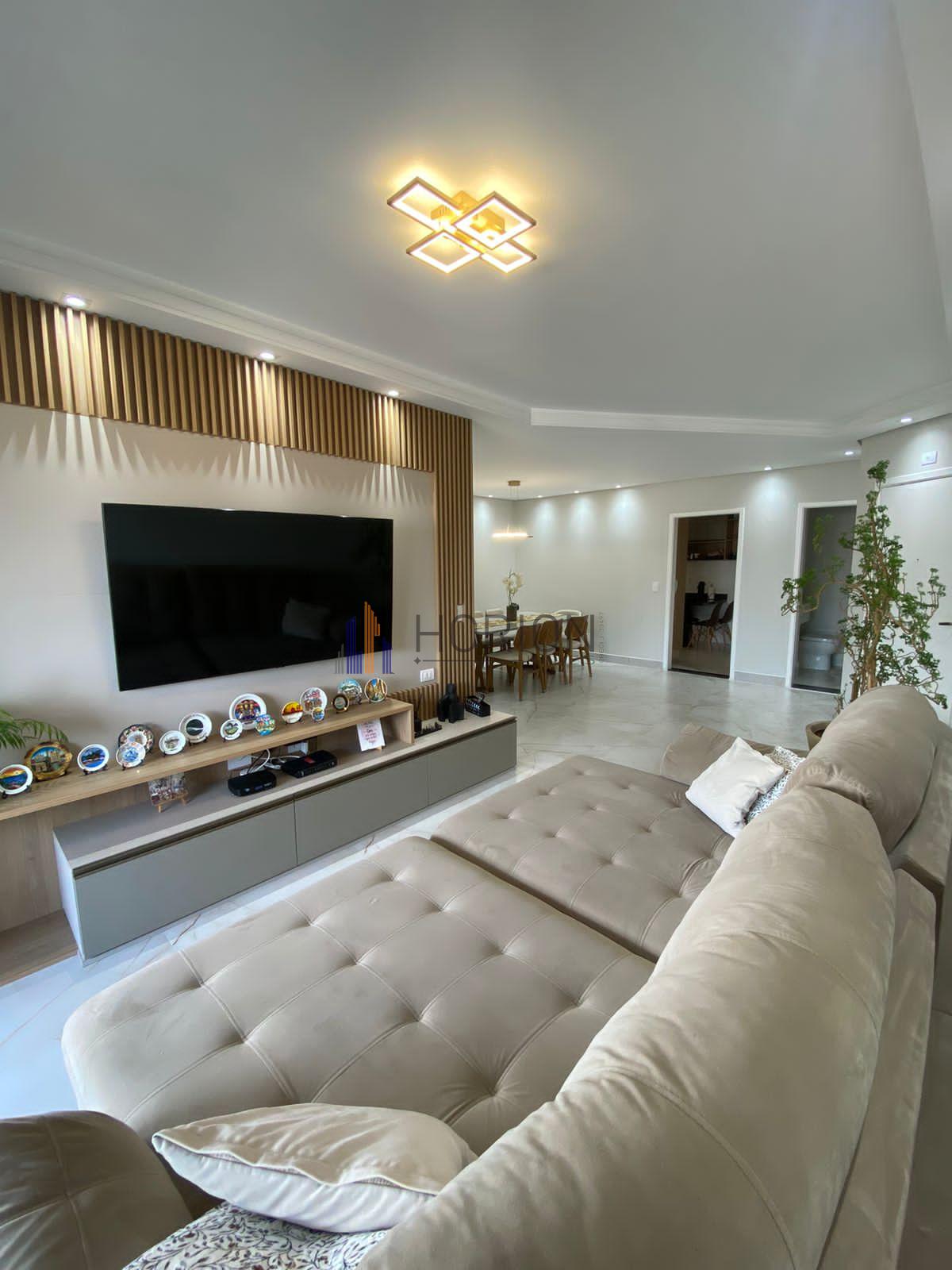 Sala de estar com rack e painel ripado planejados com material de 1a linha